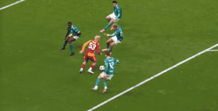 上半场补时阶段,加拉塔萨雷的高位逼抢收到效果,赫拉芬贝赫被断,之后他在背后放倒奥斯梅恩,还好是在禁区外。